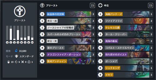 デッキコード AAECAa0GBpDTApG8ApziAqDOAsLOAqIJDNXBAuUE8gzwuwLTCpK0Auq/AuvCAsrDAqgFyssCps4CAA== プロプレイヤーのZetalot選手が使用したテンポプリーストです。 twitter.com ケレセス公爵でのバフや、プリーストの盤面支配力を活かしてテンポを取るデッ…